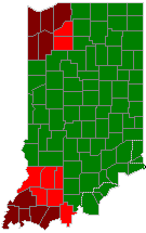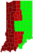 | In 1961, the Interstate Commerce Commission (in response to petitions from Indianapolis and south east Indiana) moved the eastern half of Indiana to the Eastern Time Zone but denied requests to move more of the state. The light green counties were moved to Eastern Time. The medium red counties were proposed to be moved but their move was denied. The Uniform Time Act of 1966 officially restored Daylight Saving Time starting on the last Sunday of April and ending on the last Sunday of October. The law also permitted Indiana (and other states) to opt out of observing Daylight Saving Time. The EST portion of Indiana did not officially observe EDT. (Residents of counties near Louisville KY and Cincinnatti OH unofficially observed "fast time".) | July 1961![]() | ||||||||||||