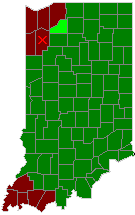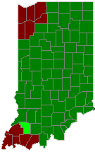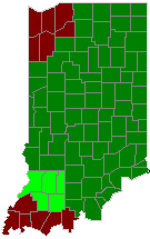 | In 1977 the Pike County Commissioners petitioned DOT to be moved to the Eastern Time Zone. After proposing the change and receiving comments, DOT approved the request. The light green county is Pike County. In 1985 the Indiana General Assembly requested that DOT move the 5 remaining southwest counties to the Eastern Time Zone but DOT denied the request, finding that the move would not serve the "convenience of commerce." | October 1977![]() | ||||||||||||
