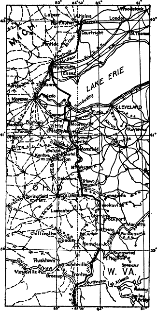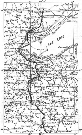 Michigan. -- Beginning on the boundary line between the United States and Canada east of Port Huron, Mich., thence southerly along the international boundary line through the St. Clair River, Lake St. Clair, Detroit River, and Lake Erie to the intersection of the international boundary line with the line between Ohio and Michigan; thence westerly along the north line of Ohio to North Cape, Mich.; thence through Maumee Bay and Maumee River to Toledo, Ohio. Ohio. -- From Toledo southerly and easterly immediately south and west of and parallel with the New York Central Railroad to Monroeville, crossing in said course the Lake Erie & Western Railroad at Fremont, the Cleveland, Cincinnati, Chicago & St. Louis Railway at Clyde, the New York, Chicago & St. Louis Railroad and the railway of the Pennsylvania Company at Bellevue; thence southerly and immediately west of and parallel with the Baltimore & Ohio Railroad to Toledo Junction, crossing in said course the Baltimore & Ohio Railroad at Willard, the Northern Ohio Railway at Plymouth, and the Cleveland, Cincinnati, Chicago & St. Louis Railway at Shelby Junction, and the Toledo division of the Pennsylvania Company at Toledo Junction; thence westerly and immediately north of and parallel with the Pittsburgh, Fort Wayne & Chicago line of the Pennsylvania Company to Crestline; thence crossing the Cleveland, Cincinnati, Chicago & St. Louis Railway and the railway of the Pennsylvania Company, and thence southerly and westerly and immediately north and west of and parallel with the Cleveland, Cincinnati, Chicago & St. Louis Railway to Galion; thence southerly and westerly and immediately north and west of and parallel with the Erie Railroad to Marion, crossing in said course the eastern division of the Toledo & Ohio Central Railway at Martel; thence crossing the Erie Railroad and the Cleveland, Cincinnati, Chicago & St. Louis Railway; thence southerly and immediately east of and parallel with the Sandusky division of the railway of the Pennsylvania Company to Columbus, crossing in said course the Cleveland, Cincinnati, Chicago & St. Louis Railway at Delaware; thence crossing the railway of the Pennsylvania Company, the Toledo & Ohio Central Railway, the Hocking Valley Railway, and the Baltimore & Ohio Railroad; thence southerly and easterly and immediately west and south of and parallel with the Hocking Valley Railway to Gallipolis, crossing in said course the Norfolk & Western Railway at Valley Crossing, the railway of the Pennsylvania Company at Lancaster, and the Hocking Valley Railway and the Baltimore & Ohio Railroad at Dundas; thence following the Ohio River along the line between Ohio and West Virginia southerly and westerly to the junction of the states of Ohio, West Virginia, and Kentucky. | |
