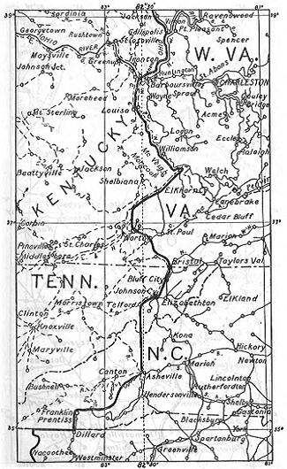 West Virginia-Kentucky. -- From the junction of said state lines along the line between West Virginia and Kentucky southerly to its intersection with the line between Kentucky and Virginia.Virginia. -- From the intersection of said state lines southwesterly following the line between Kentucky and Virginia to the west line of Dickinson county, Va.; thence southerly along said county line to its intersection with Indian Creek; thence southerly along Indian Creek to Norton; thence crossing the connection between the Norfolk & Western Railway, Southern Railway, and Louisville & Nashville Railroad southeasterly through Dungannon, and there crossing the Carolina, Clinchfield & Ohio Railway to Mendota; thence easterly and southerly and immediately north and east of and parallel with the Southern Railway to Bristol, Va.-Tenn. Tennessee-North Carolina. -- At Bristol crossing the connection between the Southern Railway and the Norfolk & Western Railway, and thence southerly and westerly immediately south and east of and parallel with the Southern Railway to Telford, Tenn., crossing in said course the Carolina, Clinchfield & Ohio Railway at Johnson City, Tenn.; thence southerly to Asheville, N. C., there crossing the Southern Railway; thence southwesterly along Pisgah Ridge to the east boundary of Jackson county, N. C.; thence southwesterly to the northern terminus of the Tallulah Falls Railway at Franklin, N. C.; thence southerly and immediately west of and parallel with said last-mentioned railway to the north boundary of Georgia. | |