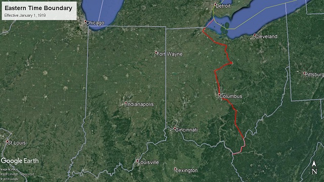 On March 19th, 1918, Congress established time zones in the US and gave the task of defining the boundaries of those zones to the Interstate Commerce Commission. The ICC quickly put in place boundaries based on local customs and started the process of establishing official time zone boundaries. On October 24, 1918, the ICC established time zone boundaries including the boundary shown on this page - dividing Eastern Time and Central Time. The initial boundaries were drawn following natural divisions including rivers and mountain ridges but the most common division on the initial map were railroads. Many boundaries followed railroads, running parallel to their tracks. These boundaries divided cities, including Toledo and Columbus Ohio, placing one side of the tracks in one time zone and the tracks and the other side of the tracks in another time zone. There were explicit exceptions for railroads that extended across the defined lines. Under the exceptions the railroad operates using the neighboring time zone while publicly showing the time for arrival and departure of trains in the correct time for the zone where the track is located. The following text officially describes the boundary between Eastern and Central time, with a sketch of that course on the adjacent maps. This boundary took effect January 1, 1919, at 2am. (See the bottom of this page for changes made effective June 1, 1919.) | |