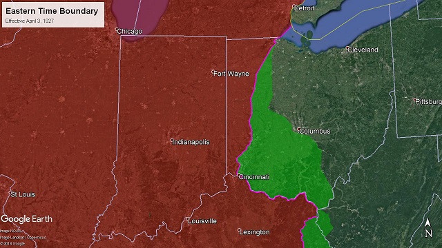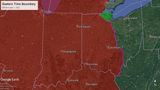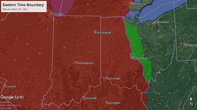 ![]() Effective April 1, 1922 - March 30, 1924 66 I.C.C. 566 - Decided March 13, 1922 - Effective April 1, 1922 Michigan-Ohio. -- Beginning on the boundary line between the United States and Canada east of Port Huron, Mich.; thence southerly and easterly along the international boundary line through the St Clair River, Lake St. Clair, Detroit River, and Lake Erie to the intersection of the International boundary line with the boundary line between the states of Ohio and Michigan; thence westerly and southerly along the north line of Ohio to the Ottawa River; thence southwesterly along the thread of the Ottawa River to the Toledo Terminal Railroad; thence westerly, southerly, easterly, and northerly immediately and respectively south, east, north, and west of and parallel with the Toledo Terminal Railroad to its intersection with the New York Central Railroad at Vickers; thence easterly and southerly immediately south and west of and parallel with the New York Central Railroad to Monroevllle, crossing in said course the Lake Erie & Western Railroad at Fremont, the Cleveland, Cincinnati, Chicago & St. Louis Railway at Clyde, the New York, Chicago & St. Louis Railroad, and the line of the Pennsylvania Company at Bellevue; thence southerly immediately west of and parallel with the Baltimore & Ohio Railroad to the northern boundary line of Perry county, near Bruno, crossing in said course the Baltimore & Ohio Railroad at Willard, the Northern Ohio Railway at Plymouth, the Cleveland, Cincinnati, Chicago & St. Louis Railway at Shelby Junction, the Chicago division of the Pennsylvania Company, and the Erie Railroad at Mansfield, the lines of the Pennsylvania Company at Mount Vernon and Newark, and the line of the Baltimore & Ohio at Newark; thence easterly and southerly along the boundary line between Perry county and Licking and Muskingum counties to the northwest corner of Morgan county, crossing in said course the Baltimore & Ohio Railroad near Bruno, the Zanesvllle & Western Railway near Fultonham and East Fultonham, and the Zanesvllle division of the Pennsylvania Company at Roseville; thence easterly along the northern boundary line of Morgan county to the Meridian 82° west; thence south along said meridian to the Ohio River, crossing in said course the Federal Valley Railroad at Lewis and the Baltimore & Ohio Railroad at Canaanvllle; thence following the Ohio River along the line between Ohio and West Virginia southerly and westerly to the junction of the states of Ohio, West Virginia, and Kentucky. Effective August 27, 1922 the boundary was changed to add the City of Detroit to Eastern Time. At the time Michigan state law specified Central Time and Detroit city law specified Eastern Time. 73 I.C.C. 78 - Decided July 25, 1922 - Effective August 27, 1922 Michigan. -- Beginning on the boundary line between the United States and Canada east of Port Huron, Mich.; thence southerly along the International boundary line through the St. Clair River and Lake St. Clair to its intersection with the easterly boundary of the city of Detroit; thence northwesterly, westerly, southerly, and easterly, along the boundary of the city of Detroit to its intersection with the international boundary in the Detroit River; thence southerly along the international boundary line in the Detroit River and Lake Erie to its Intersection with the boundary line between the States of Ohio and Michigan. ![]() Effective March 30, 1924 - August 31, 1924 88 I.C.C. 135 - Decided March. 13, 1924 - Effective March 30, 1924 Ohio. -- From the intersection of the international boundary between the United States and Canada with the boundary between the States of Ohio and Michigan thence westerly and southerly along the north line of Ohio to the Ottawa River; thence southwesterly along the thread of the Ottawa River to the Toledo Terminal Railroad; thence westerly, southerly, and easterly immediately and respectively south, east, and north of and parallel with the Toledo Terminal Railroad to its intersection with the eastern division of the Ohio Central lines of the New York Central Railroad west of Walbridge; thence southerly immediately west of and parallel with the said eastern division of the Ohio Central lines to its intersection with the Hocking Valley Railway at Fostoria; thence southerly immediately west of and parallel with the Hocking Valley Railway to its intersection with the boundary of the city of Columbus, crossing in said course the lines of the New York, Chicago & St. Louis Railroad and the line of the Baltimore & Ohio Railroad at Fostoria, the Northern Ohio Railway and the Cleveland, Cincinnati, Chicago & St. Louis Railway at Carey, the Pennsylvania Railroad at Upper Sandusky, the Erie Railroad at Marlon, and the lines of the Cleveland, Cincinnati, Chicago & St. Louis Railway at Marion and at Delaware; thence westerly, southerly, and easterly along the boundary of the city of Columbus to Its intersection with the Hocking Valley Railway at South Columbus; thence southerly and easterly immediately west and south of and parallel with the Hocking Valley Railway to the Ohio River at Gallipolis, crossing in said course the Norfolk & Western Railway at Valley Crossing, the Pennsylvania Railroad at Lancaster, and the Baltimore & Ohio Railroad and a branch of the Hocking Valley Railway at Dundas; thence following the Ohio River along the boundary between Ohio and West Virginia to its intersection with the east line of Wayne County, W. Va. West Virginia. -- From the intersection of the boundary between Ohio and West Virginia with the east line of Wayne County southerly along the said east line of Wayne County to its intersection with the Norfolk & Western Railway near Wilsondale; thence southerly, westerly, and southerly immediately and respectively east, south, and east of and parallel with the Norfolk & Western Railway to Williamson; thence southerly immediately west of and parallel with the Pond Creek branch of the Norfolk