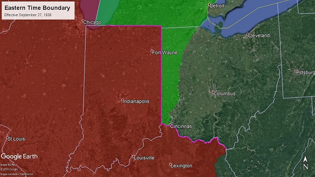 | 1941 - Entire State of Georgia moved to Eastern Time. 246 I.C.C. 721 [6 FR 5345-5347] - Decided October 15, 1941 - Effective November 23, 1941 Georgia. -- From the last-mentioned point west along said State boundary line to the west boundary of Georgia; thence southerly along said State boundary line to the southwest corner of the State. Florida. -- From the last-mentioned point southerly along the main channel of the Apalachicola River to Apalachicola Bay and the Gulf of Mexico. 1947 - Virginia, North Carolina, parts of Kentucky and parts of Tennessee moved to Eastern Time. 269 I.C.C. 57 [12 FR 5891-5892] - Decided August 25, 1947 - Effective September 28, 1947 Kentucky. -- From Catlettsburg south immediately west of and parallel with the Big Sandy division of the Chesapeake & Ohio Railway to the northern boundary of Lawrence County, Ky.; thence westerly and southerly along the west lines of Lawrence, Johnson, and Floyd Counties and the south line of Pike County to the boundary line between Kentucky and Virginia; thence southwesterly along that State boundary line to the east line of Harlan County, Ky.; thence northwesterly and southwesterly along the east and north lines of Harlan County and westerly along the north line of Bell, Knox, Whitley and McCreary Counties, Ky., to the line of the Cincinnati, New Orleans & Texas Pacific Railway (Southern Railway system); thence southerly just east of and parallel with that road to the boundary between Kentucky and Tennessee. Tennessee. -- Thence southerly just east of and parallel with the line of the Cincinnati, New Orleans & Texas Pacific Railway to the north line of Rhea County, Tenn.; thence southeasterly and southwesterly along the north and east lines of Rhea County and east line of Hamilton County, Tenn., to the boundary between Tennessee and Georgia. 1949 - Hamilton County TN moved to Eastern Time. 274 I.C.C. 695 - Decided August 5, 1949 - Effective August 14, 1949 Tennessee. -- Thence southerly just east of and parallel with the line of the Cincinnati, New Orleans & Texas Pacific Railway to the north line of Rhea County, Tenn., thence southeasterly and southwesterly along the north and west lines of Hamilton County to the boundary along the north and west lines of Hamilton County to the boundary between Tennessee and Georgia. 1949 - Rhea County TN moved to Eastern Time. 276 I.C.C. 128 - Decided August 17, 1949 - Effective August 28, 1949 Tennessee. -- Thence southerly just east of and parallel with the line of the Cincinnati, New Orleans & Texas Pacific Railway to the north line of Rhea County, Tenn., thence northwesterly along the north line of Rhea County; thence southwesterly along the west lines of Rhea and Hamilton Counties to the boundary between Tennessee and Georgia. ![]() Effective April 3, 1960 - July 23, 1961 309 I.C.C. 780 - Decided February 29, 1960 - Effective April 3, 1960 Indiana-Ohio. -- From the northeast corner of the State of Indiana southerly along the eastern boundary of Indiana and the western boundary of the State of Ohio to the Ohio River. Kentucky. -- From the southwest corner of the State of Ohio westerly and southerly along the thread of the Ohio River to the mouth of the Kentucky River; thence southerly along the thread of the Kentucky River to the north line of Franklin County; thence westerly along the north line of Franklin County to the northwest corner of that county; and thence in a generally southerly direction along the west or south lines of Franklin, Anderson, Mercer, Boyle, Lincoln, Pulaski, and McCreary Counties to the boundary between the States of Kentucky and Tennessee. Tennessee. -- From the southwest corner of McCreary County, Ky., westerly along the northern boundary of the State of Tennessee to the west line of Scott County, Tenn.; thence in a generally southerly direction along the west line of Scott County, the north and west lines of Morgan County, and the north line of Roane County to the north line of Rhea County; thence northwesterly along the north line of Rhea County; and thence southwesterly along the west lines of Rhea and Hamilton Counties to the boundary between the States of Tennessee and Georgia. | |