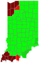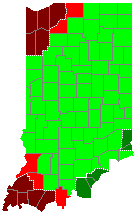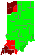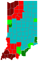 In compliance with the law, Governor Daniels sent a letter to the US DOT on May 20th. The US DOT responded to the petition on August 11th by asking any county that wished to change time zones submit a petition to the DOT following the standard procedure. A deadline of September 16th was set for government officials to file a petition.23 counties filed petitions with 18 requesting Central Time and 5 requesting Eastern Time. Most eligible counties did not file petitions. The map to the right illustrates counties that filed petitions with the US DOT. The dark red and green counties are the 15 specified in Indiana's SB127 as staying in their respective time zones. Red counties filed petitions to move to Central Time. Green counties specifically requested Eastern Time. Fountain County decided to ask for selected parts of their county to join Central Time. | |